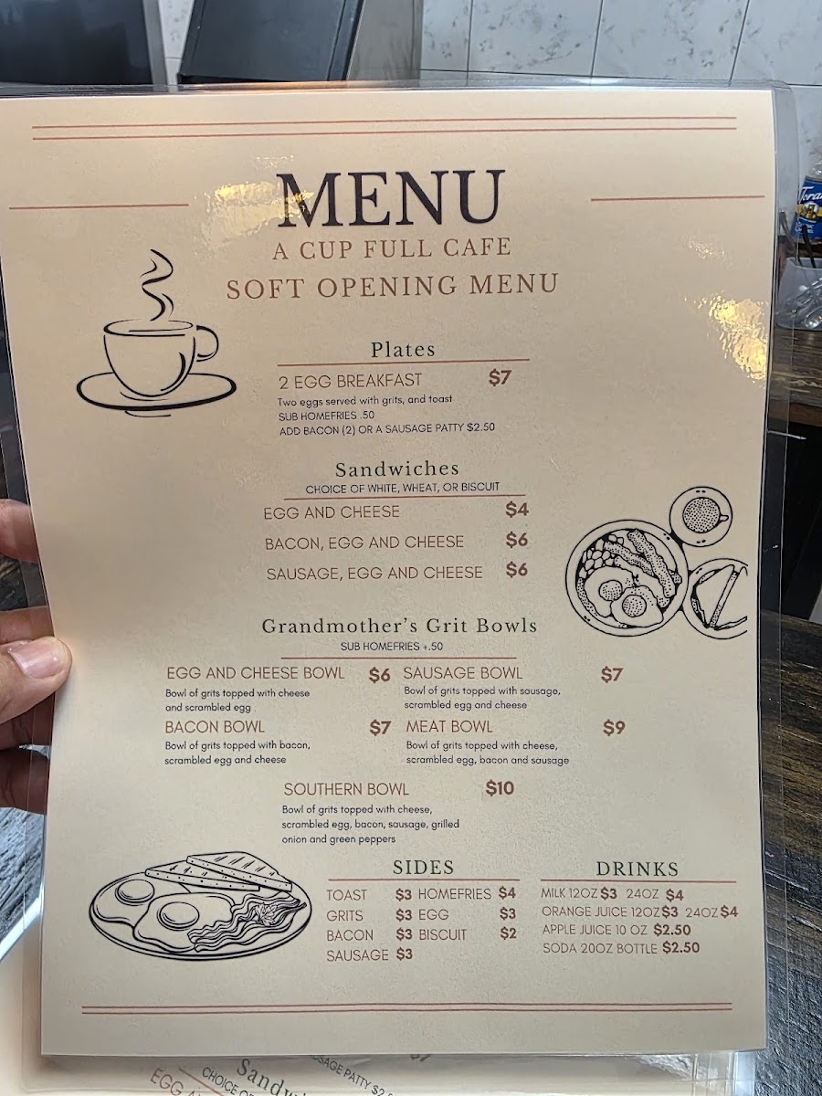 The menu at A Cup Full Cafe primarily features a variety of coffee and tea beverages alongside a limited selection of breakfast items and light sweets. It is designed to accommodate customers looking for a morning meal or a casual coffee break.